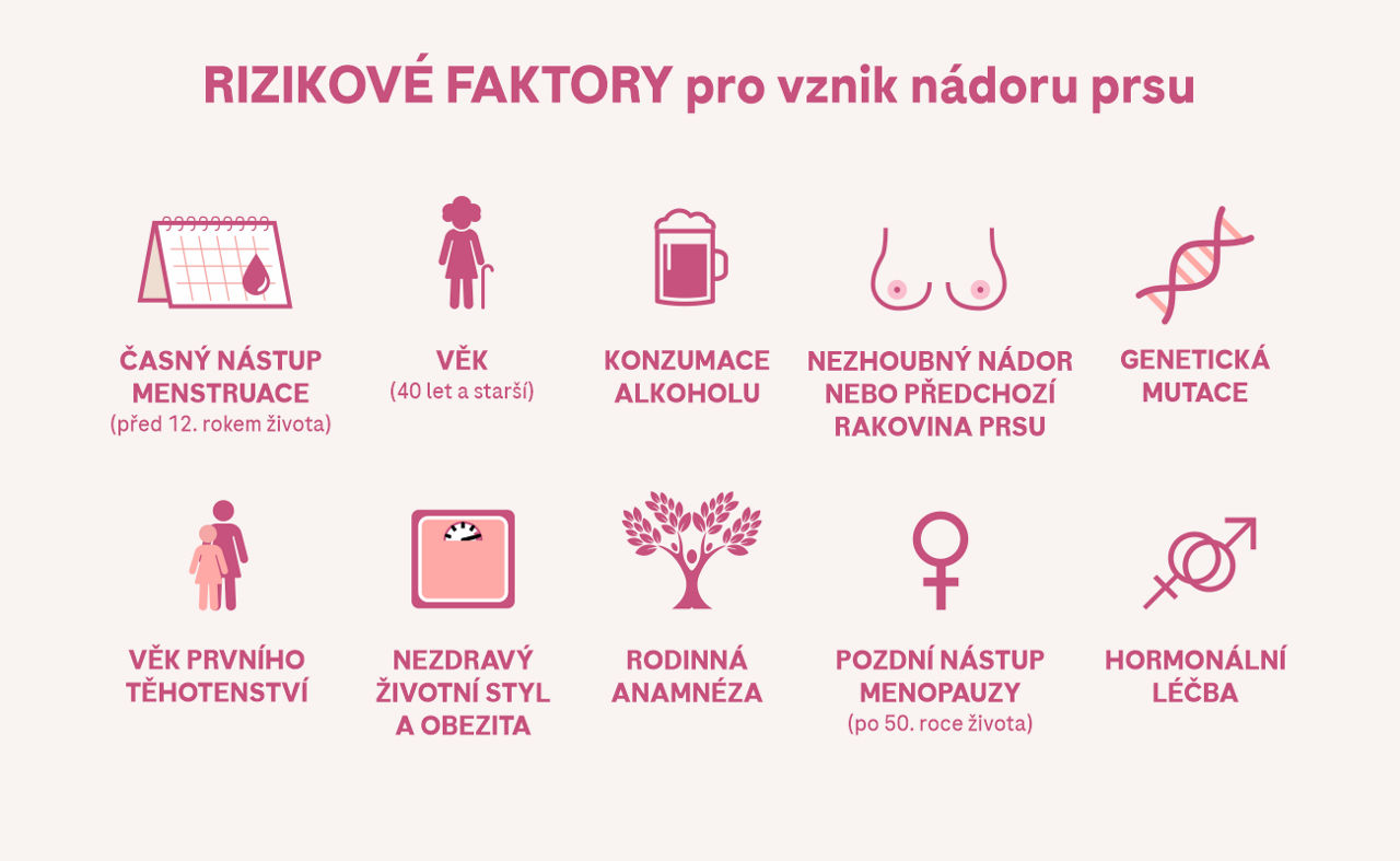- Pozitivní rodinná anamnéza, tj. výskyt karcinomu prsu v rodině u pokrevních příbuzných prvního stupně (to jsou rodiče, sourozenci, potomci)